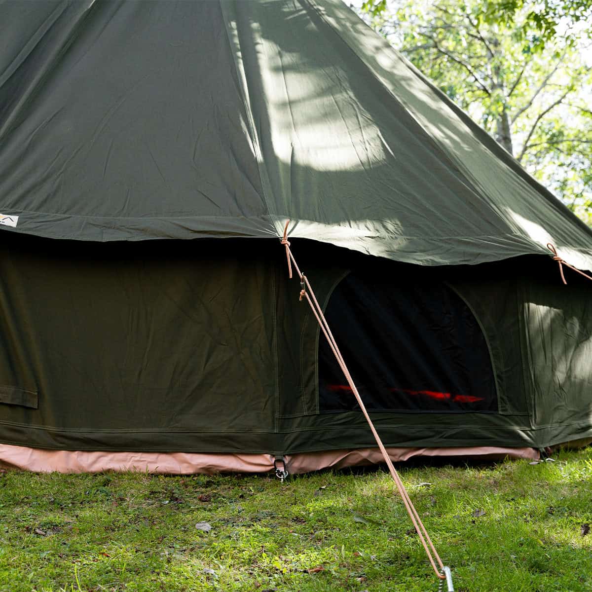 The new 5m Olive Green Kokoon Deluxe XL bell tent with chimney fitting features higher walls & doors for a more spacious camping experience. Ideal for taller campers, with a 2m high door opening & an extra 20cm wall height compared to our original Kokoon Deluxe model.